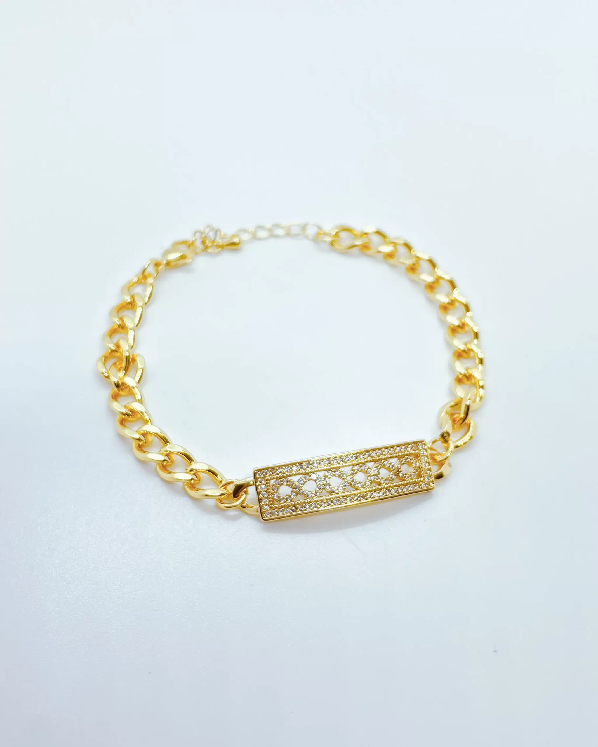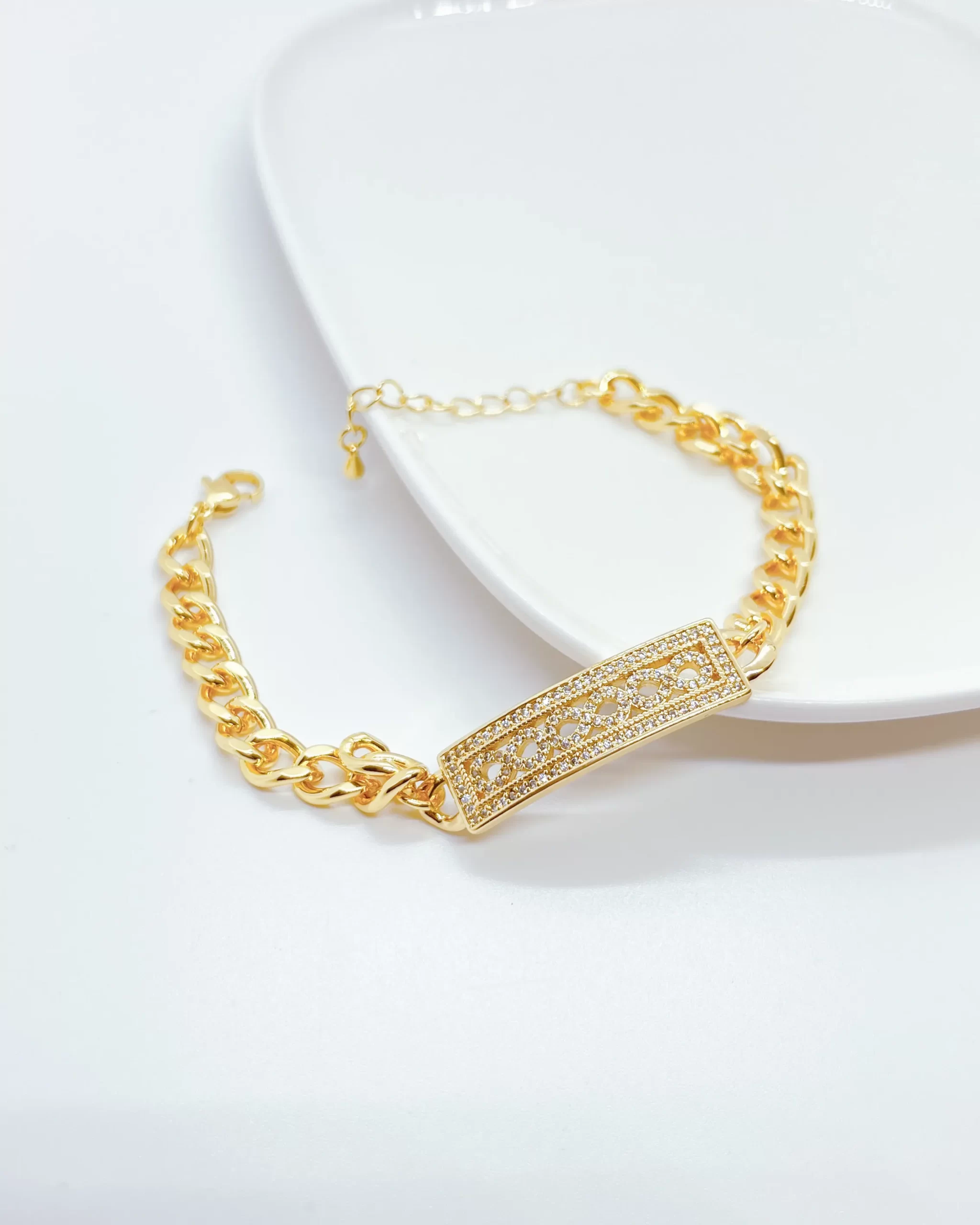 Pulsera para dama, laminado de oro con incrustación circonita, extremos tipo cadena